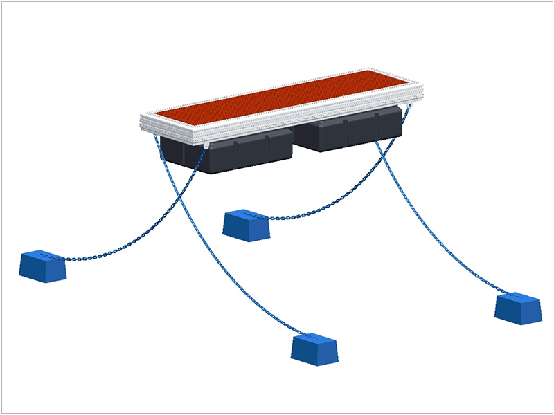 El pontón está anclado por el cable elástico de fibra de caucho y el hormigón bajo el lecho marino.El dispositivo sealex es muy fuerte y estable, por lo que el puente flotante siempre mantiene la misma posición horizontal y la altura del francobordo en el cambio de marea, y puede ajustar la flotabilidad dentro del rango del 70%.
